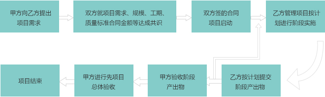 甲方将软件系统、产品的全部或部分以项目的方式外包给乙方,双方约定好项目的需求、规模、工期、质量标准、合同金额等要素,由乙方任命项目经理进行管理、组织技术人员负责实施。项目管理由乙方负责,受甲方监督。乙方需要为项目的进度、质量负责。